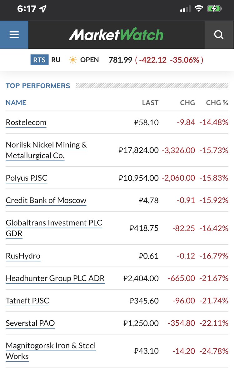 Russian stocks crash 33% and ruble plunges to record low ... The Moscow stock exchange had suspended trading earlier on Thursday but when dealing resumed, stocks went into free-fall. The MOEX index plunged as much as 45%, while the RTS index — which is...