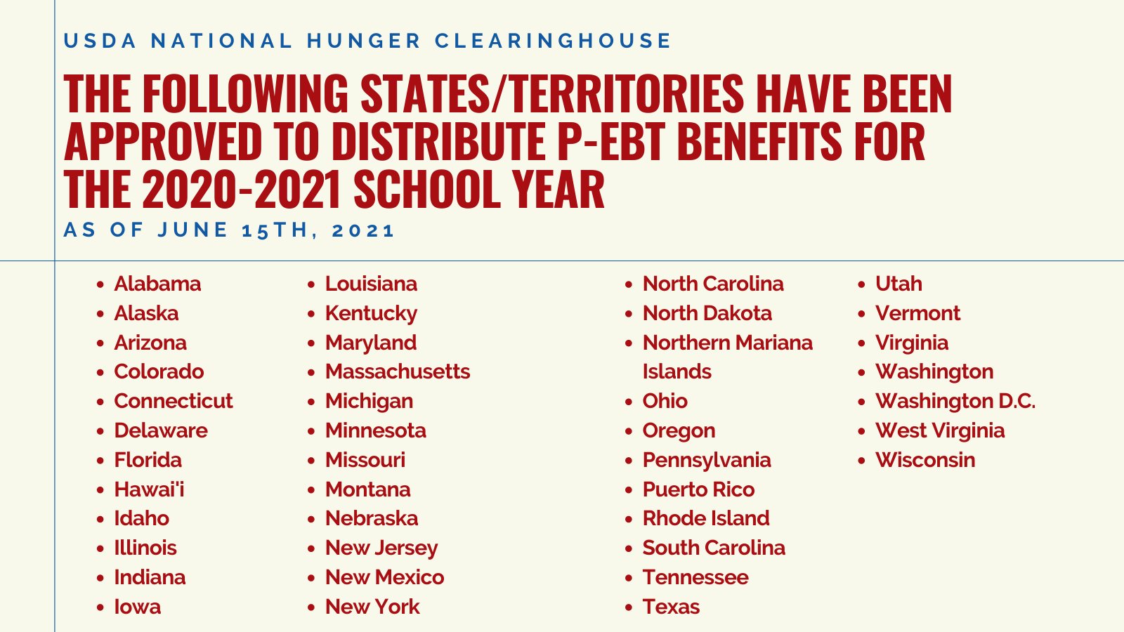 Lessons From Early Implementation of Pandemic-EBT | Center on... Though P-EBT was optional for states and the Department of Agriculture (USDA) required them to P-EBT program they built over the past few months to help ease the ongoing hardship low-income...