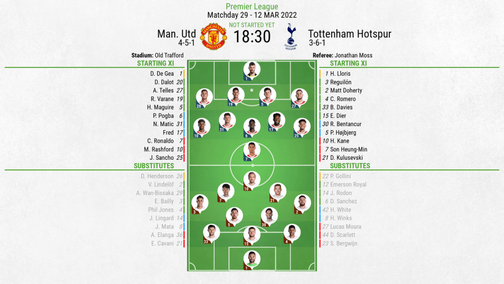 Manchester United vs Tottenham live: Build-up and updates ... Mar 12, 2022 · Welcome to The Athletic's coverage of this huge Premier League clash between Manchester United and Tottenham Hotspur.United came away with the win last time these two sides met, a resounding 3-0 ... Manchester United vs Tottenham Hotspur - English Premier ... 5 days ago — Follow live match coverage and reaction as Manchester United play Tottenham Hotspur in the English Premier League on 12 March 2022 at 17:30 ... Манчестер Юнайтед - Тоттенхэм: смотреть онлайн... | Soccer365.ru Manager's Press Conference | Manchester United v Tottenham Hotspur | Ralf Rangnick | Premier League. Training | Manchester United prepare for visit of Tottenham Hotspur | Premier League. Manchester United FC vs Tottenham Hotspur FC, As it happened 23' Man Utd player Cristiano Ronaldo strikes the header off target, ball is cleared by the Tottenham. 21' Jon Moss has awarded corner kick to Tottenham. Tottenham Hotspur FC (3-4-2-1). Antonio Conte (Manager). Manchester United FC Subs. 26. Dean Henderson.